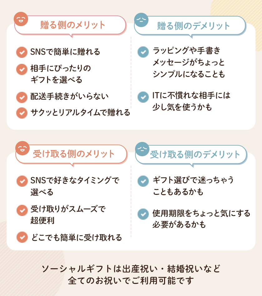 「ソーシャルギフト」は贈る側にも受け取る側にもメリットがたくさん♪忙しいパパ・ママが自分のタイミングでギフトを受け取ることができます。